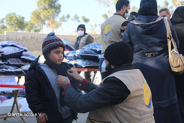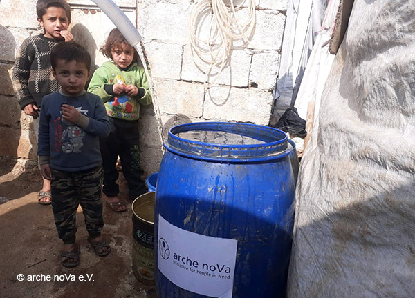 In einem zweiten Projekt wird unser Projektpartner Arche noVa Lebensmittel, Hygieneartikel und Winter-Kits für die kalte Jahreszeit zur Verfügung stellen. Die Familien der Schülerinnen und Schüler aus dem oben genannten Bildungsprojekt, aber auch andere bedürftige Familien, brauchen diese überlebenswichtigen Pakete dringend! Um Krankheiten vorzubeugen, insbesondere eine Infektion durch COVID19, werden Hygieneartikel in sogenannten Kits verteilt. Die Winter-Kits wiederum enthalten warme Fleece-Jacken, Mützen und Schals, denn der Winter in Syrien ist fast genauso kalt wie in unseren Breiten. Zusätzlich erhalten die Gemeinden, die von der Wasserversorgung abgeschnitten sind, sauberes Trinkwasser für ihre Grundbedürfnisse.